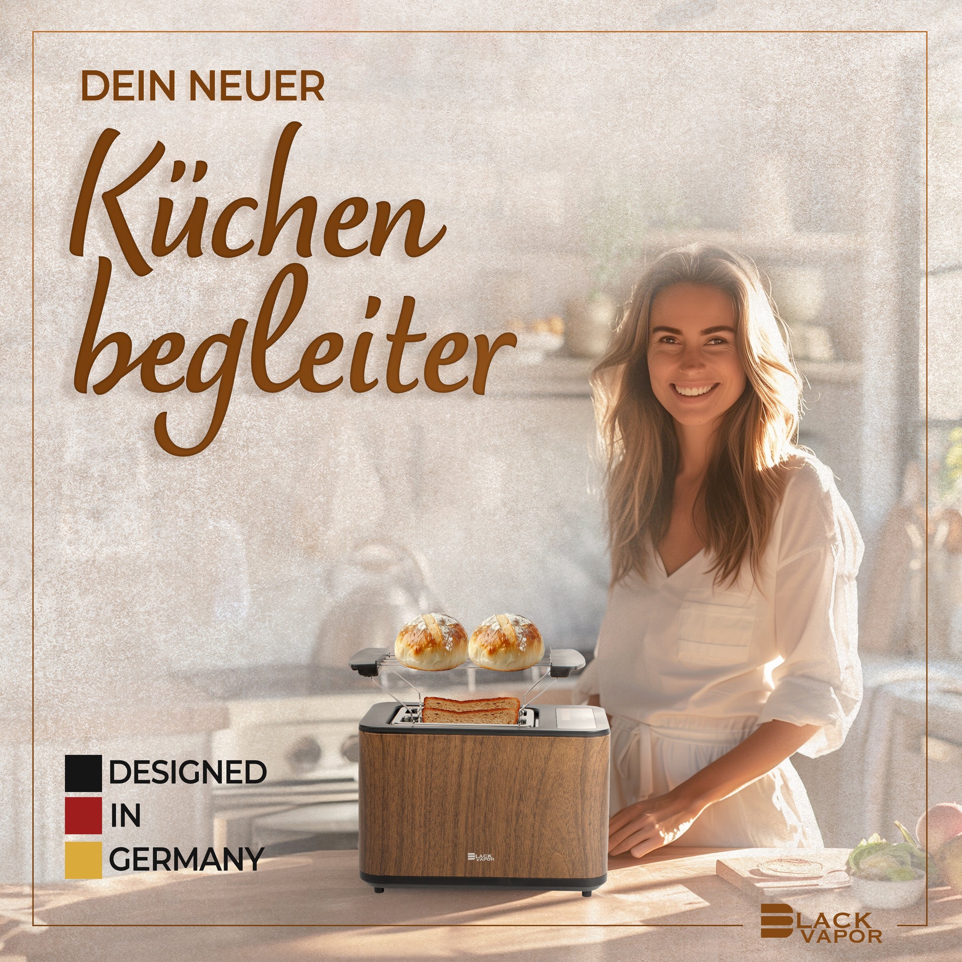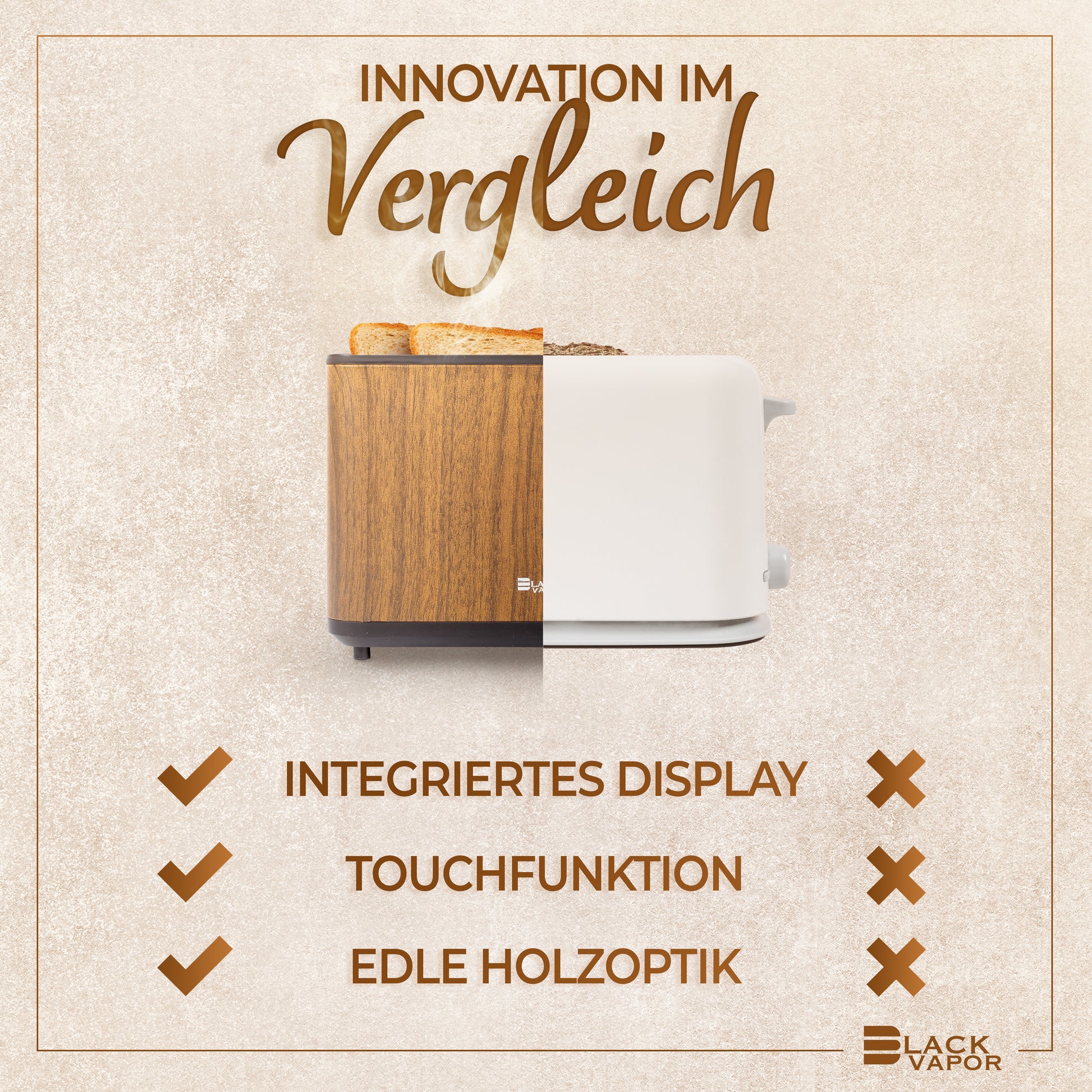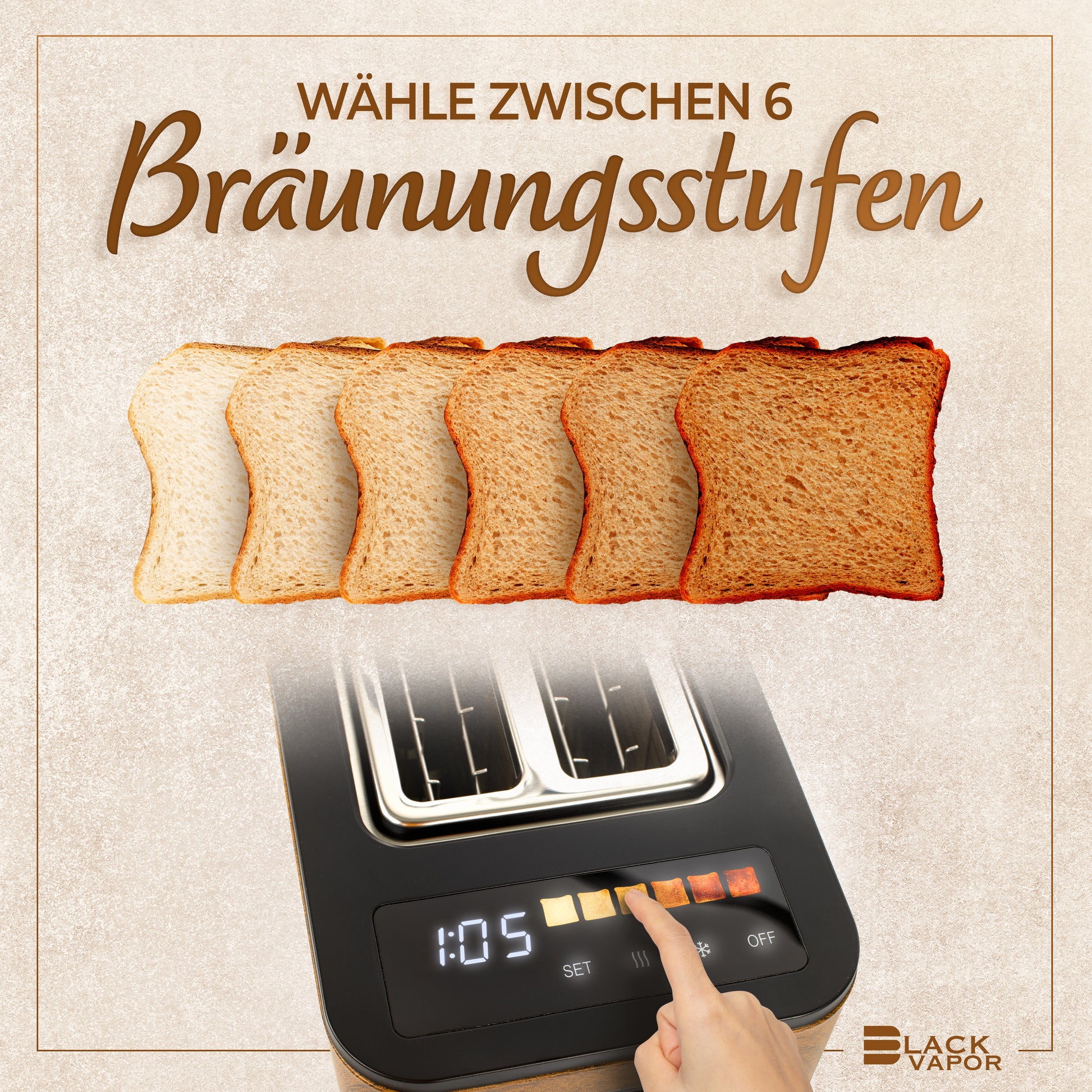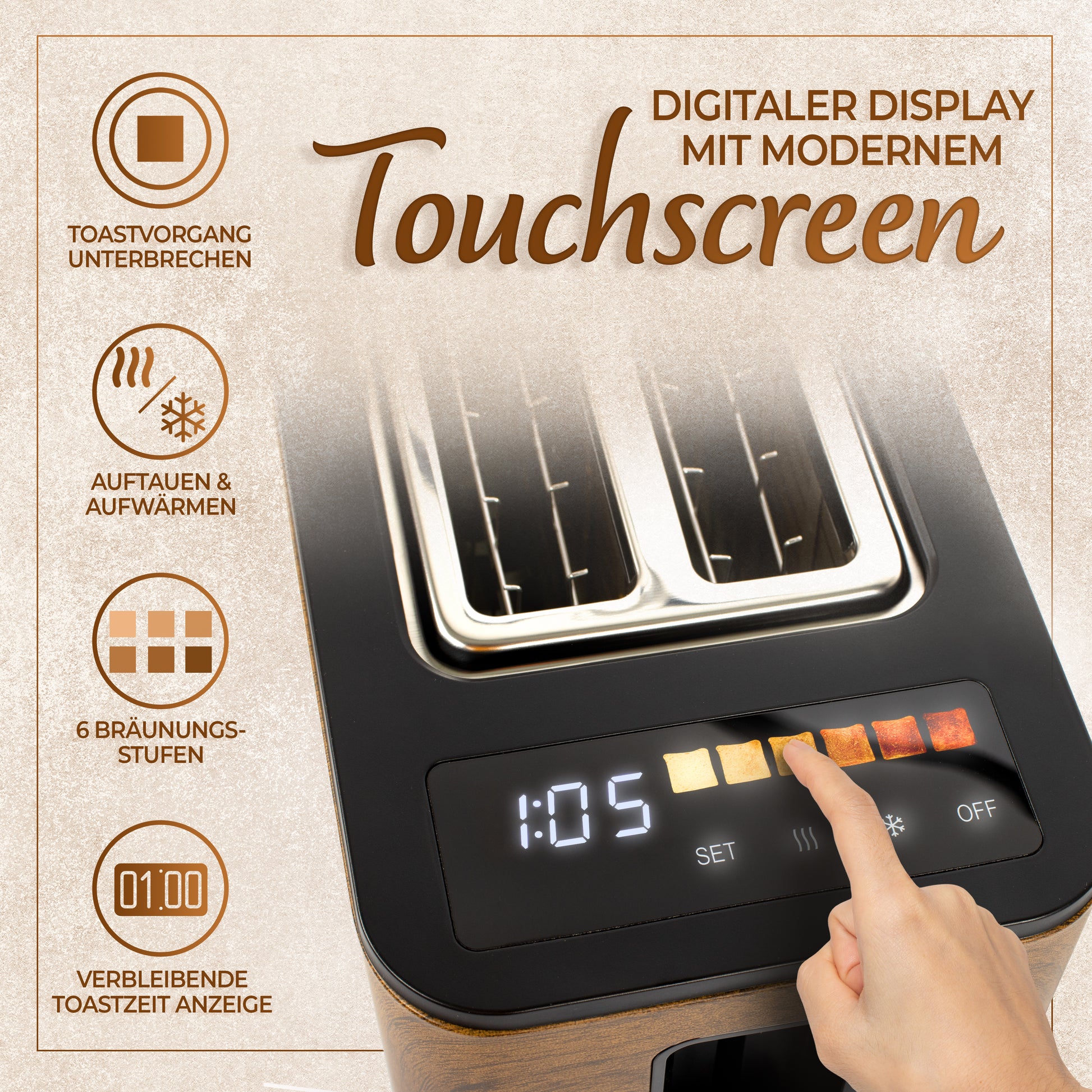 With this toaster in a classy wooden look, you can enjoy your perfect toast at the touch of a button. The compact device combines modern design with innovative technology: a digital display and an intuitive touchscreen enable the precise setting of 6 different browning levels. Whether defrosting, warming up or browning - the versatile functions always guarantee the desired result. The elegant wooden look fits seamlessly into any kitchen, while the easy-to-clean crumb tray and automatic switch-off ensure maximum convenience and safety. Quality you can feel - for a breakfast that inspires.